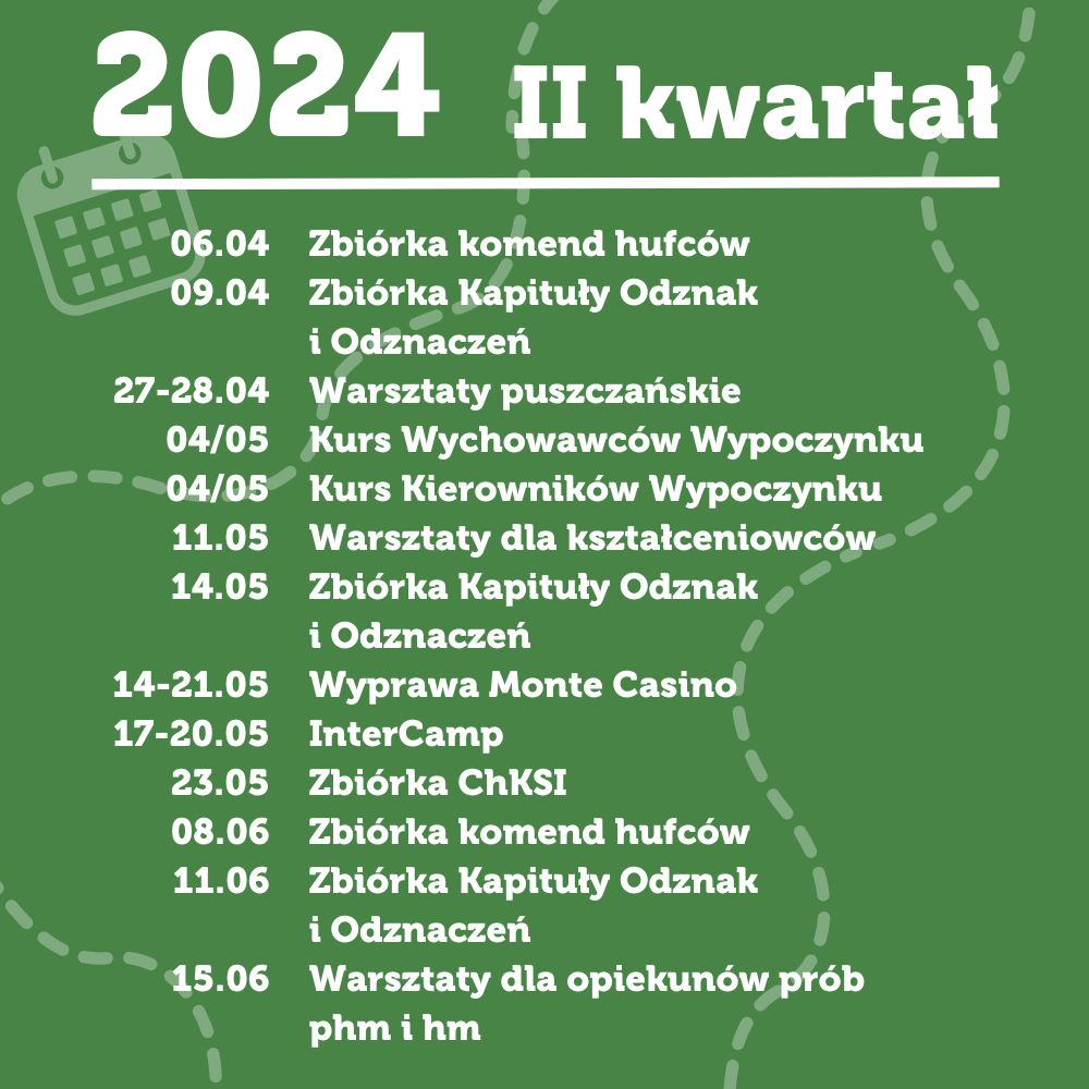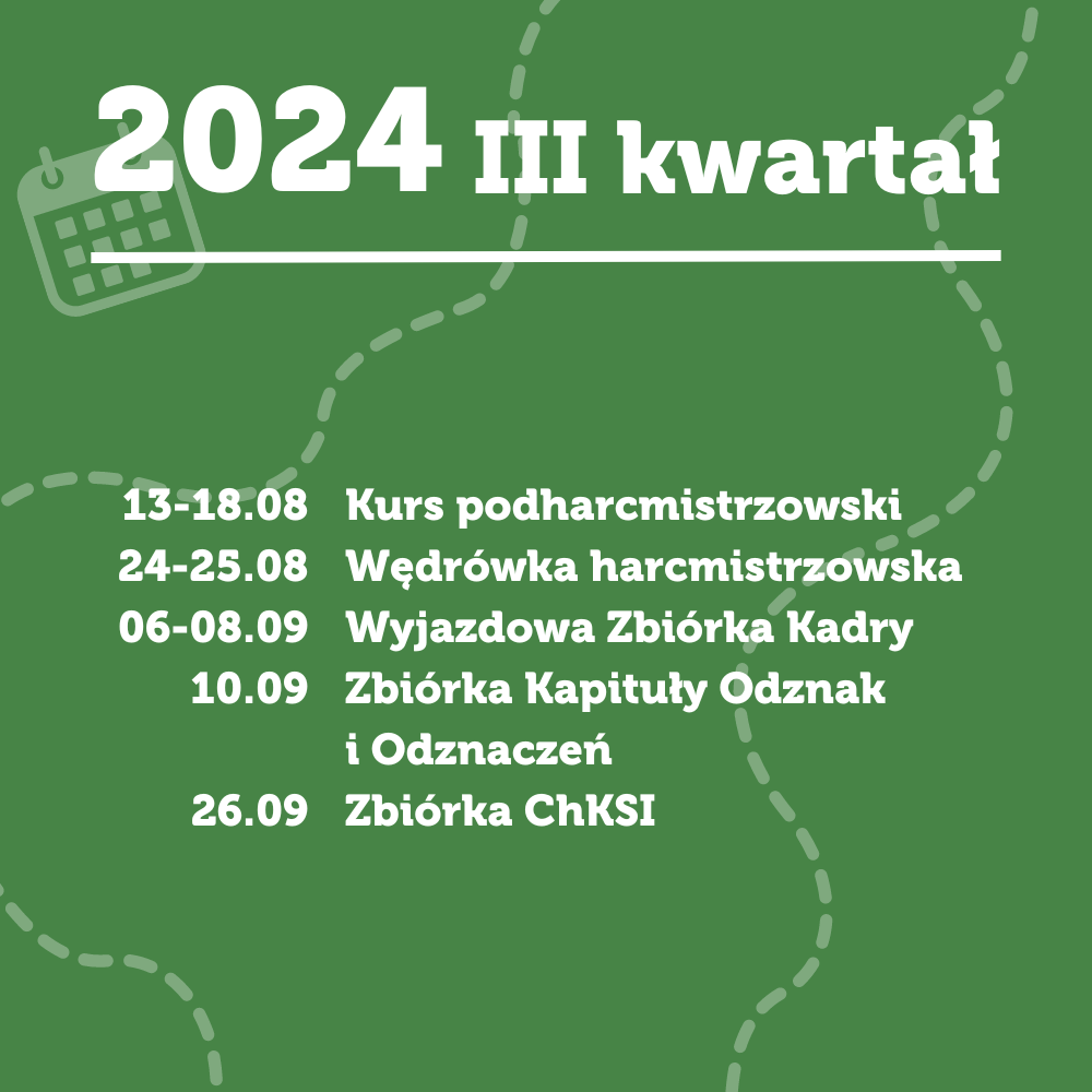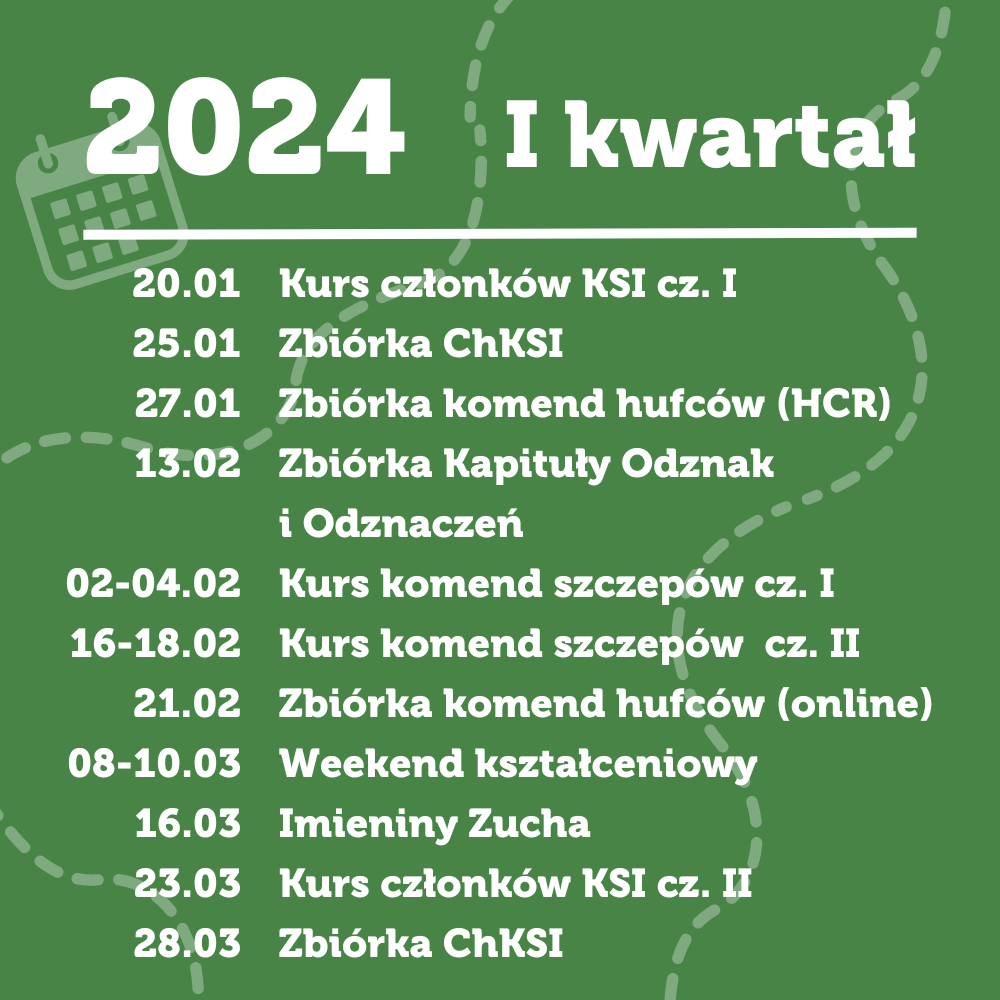 Przed nami w Chorągwi Ziemi Lubuskiej ZHP mnóstwo przedsięwzięć kształceniowych i programowych. Zachęcamy do zapoznania się z poniższym kalendarium i uwzględnieniem go w planowaniu wydarzeń na najbliższe miesiące. Wszystkie szczegóły dotyczące kursów i imprez chorągwianych pojawiają się na bieżąco na naszej stronie internetowej i profilu na Facebooku.